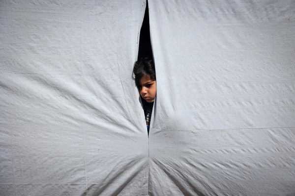 ラファにあるテントの中から外を見る12歳のレムさん。(ガザ地区、2024年5月6日撮影)