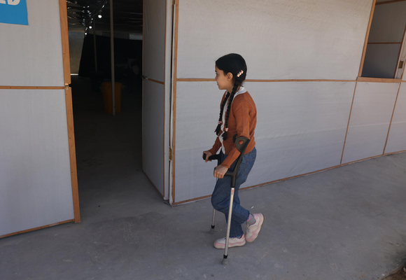 自宅で寝ているときに空爆に遭い、左脚を負傷した9歳のドーハさん。その空爆により両親は亡くなった。(ガザ地区、2024年4月30日撮影)