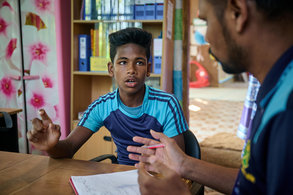 コックスバザールのロヒンギャ難民キャンプにある支援センターで、ケースワーカーと話す13歳のヌールさん。ヌールさんは家族から身体的虐待を受け、通っていた学習センターから連れ出されて働くことを強いられた。(バングラデシュ、2023年11月撮影)