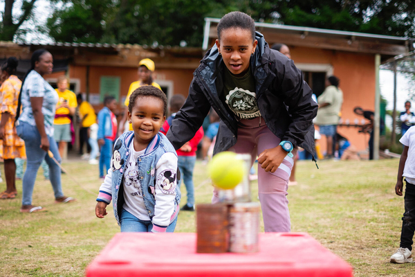 クワズール・ナタール州のデイケアセンターで行われた「遊びの力(Power of Play)」キャンペーンのイベントに参加する親子。(南アフリカ、2024年2月撮影)