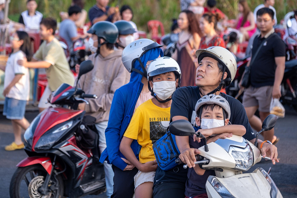 ホーチミンで、マスクを着用してバイクに同乗する子どもたち。ベトナムでは、老朽化した自動車の排気ガスや、石炭発電、廃棄物処理による大気汚染が課題になっている。(ベトナム、2024年4月撮影)