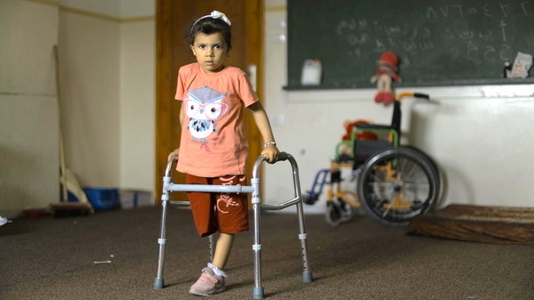 自宅で寝ている間に爆撃に遭い、右脚を切断された4歳のシラちゃん。両親と3人の姉妹を失い、今は祖母や叔母とともに学校に避難している。(ガザ地区、2024年5月24日撮影)