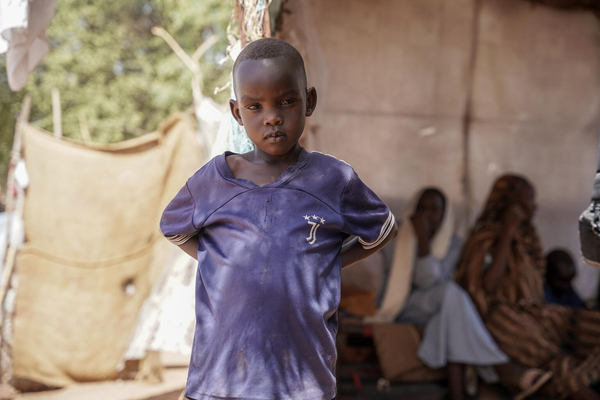 北ダルフールのエルファーシルで起きた武力衝突によって、家族と避難している男の子。(スーダン、2024年5月3日撮影)