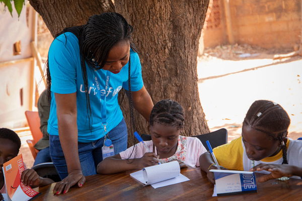 ボボ・ディウラッソで行なわれたユニセフのワークショップで、詩の書き方を学び、平和についての詩を書く子どもたち。(ブルキナファソ、2024年3月撮影)