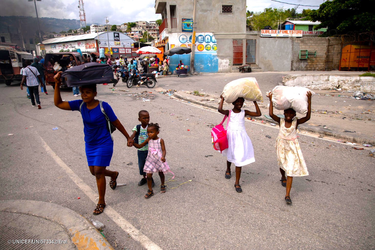 一晩中、自宅近くで銃撃戦があり、わずかな荷物を持って避難する家族。(ハイチ、2024年5月1日撮影)