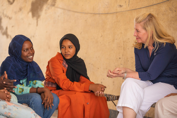 ポートスーダンの国内避難民キャンプで、紛争により避難してきた15歳のルジャインさん(左)と14歳のボタイナさん(中央)と話すラッセル事務局長。(スーダン、2024年6月25日撮影)