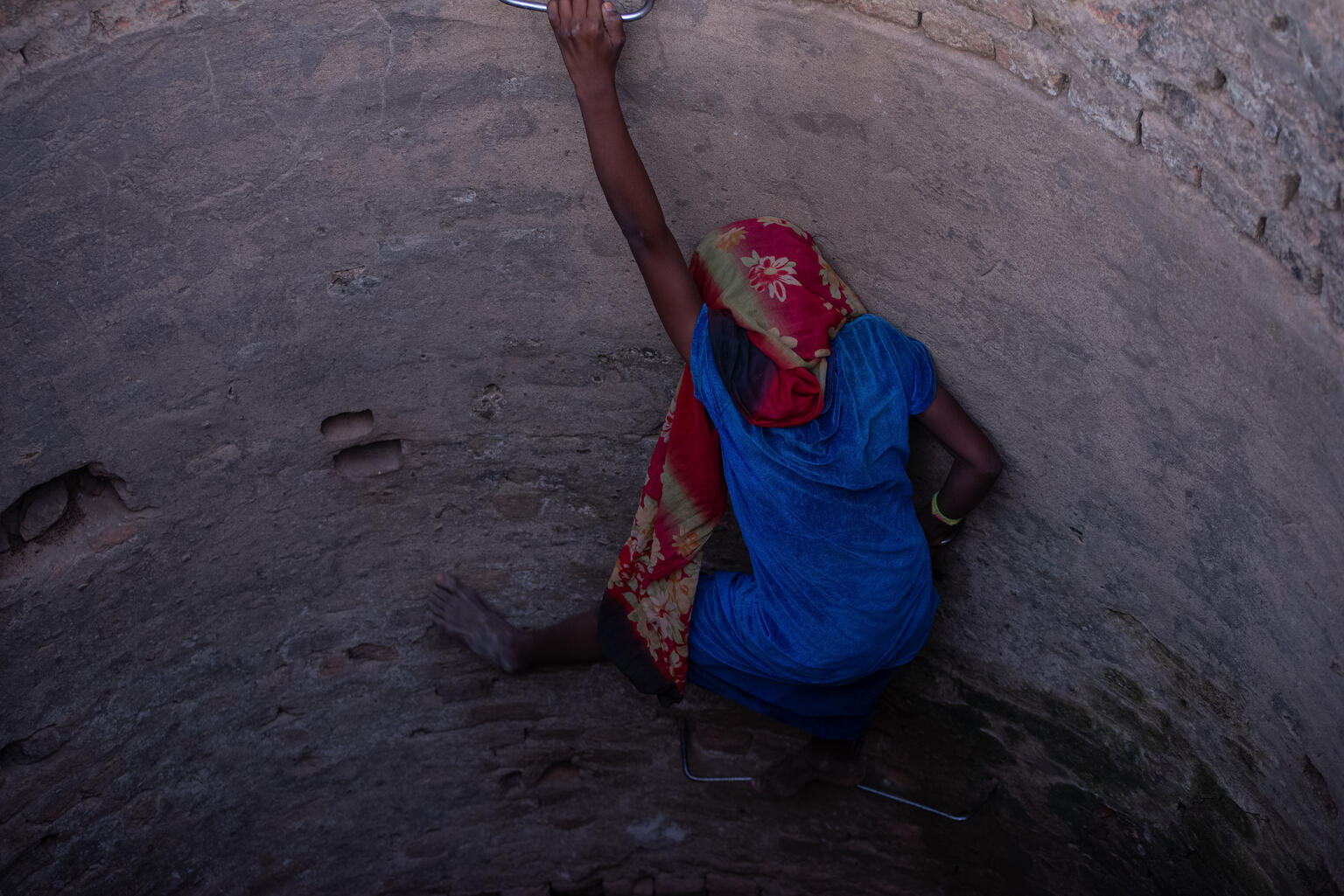 マヤダさんも一家の水くみを担っています。古くて深い井戸の底から湧き出る水をくむために、鉄の取っ手につかまりながら、壁に空いた小さな穴に足をかけて、井戸の底に降りていきます。とても慣れた身のこなしから、彼女がこうした水くみを繰り返し行ってきたことが分かります。