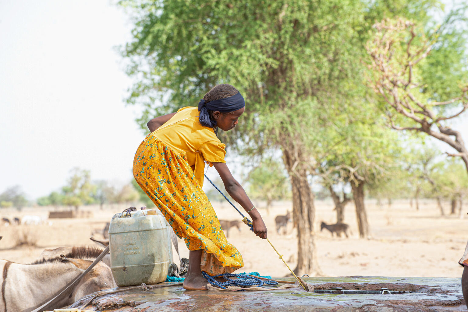 ムズダリファさん(12歳)は、井戸の底で怯えた表情で、20リットルのタンクがいっぱいになるまで金属製の容器で水をすくって移していました。彼女は長い間、こうした恐怖と負担に耐えてきました。