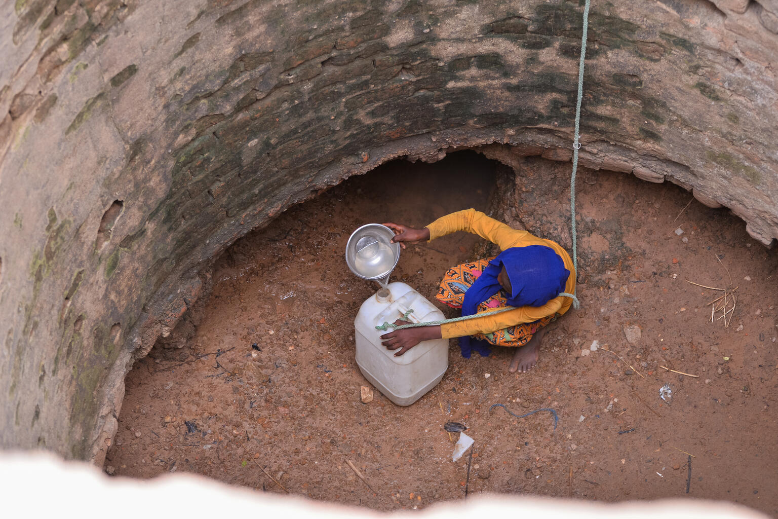 深い井戸の底で、タンクがいっぱいになるまで容器で湧き水をすくって移すムズダリファさん(スーダン、2024年5月15日撮影)