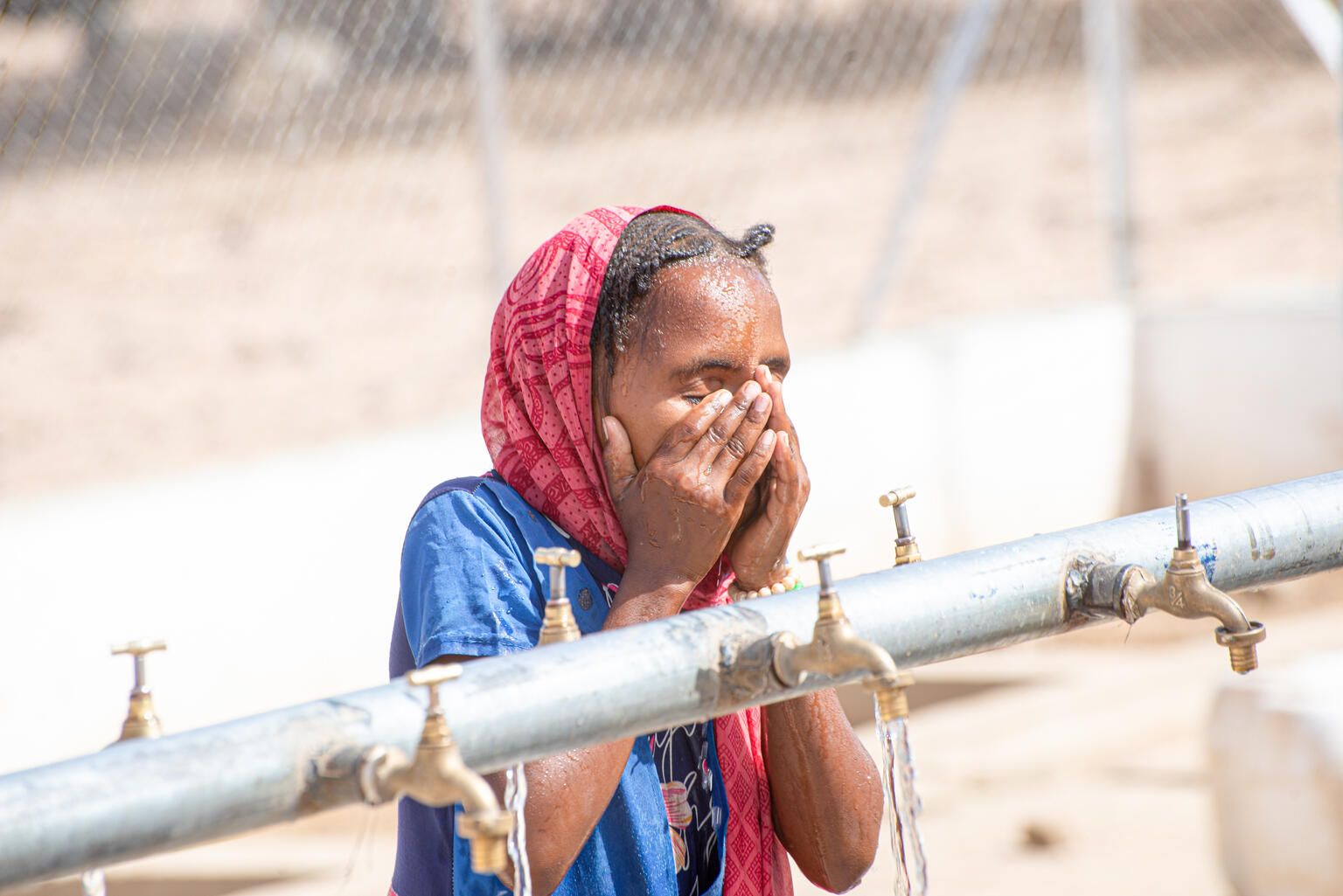 給水施設の蛇口から出てくるきれいな水で顔を洗うヌジョドさん(スーダン、2024年5月2日撮影)