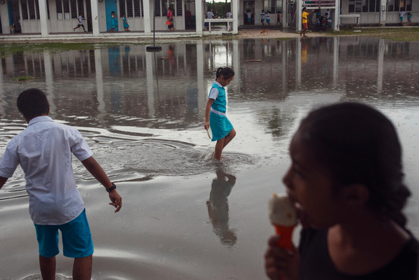 フォンガファレ島で、暴風雨により浸水した小学校の校庭を歩く子どもたち。(ツバル、2023年10月撮影)