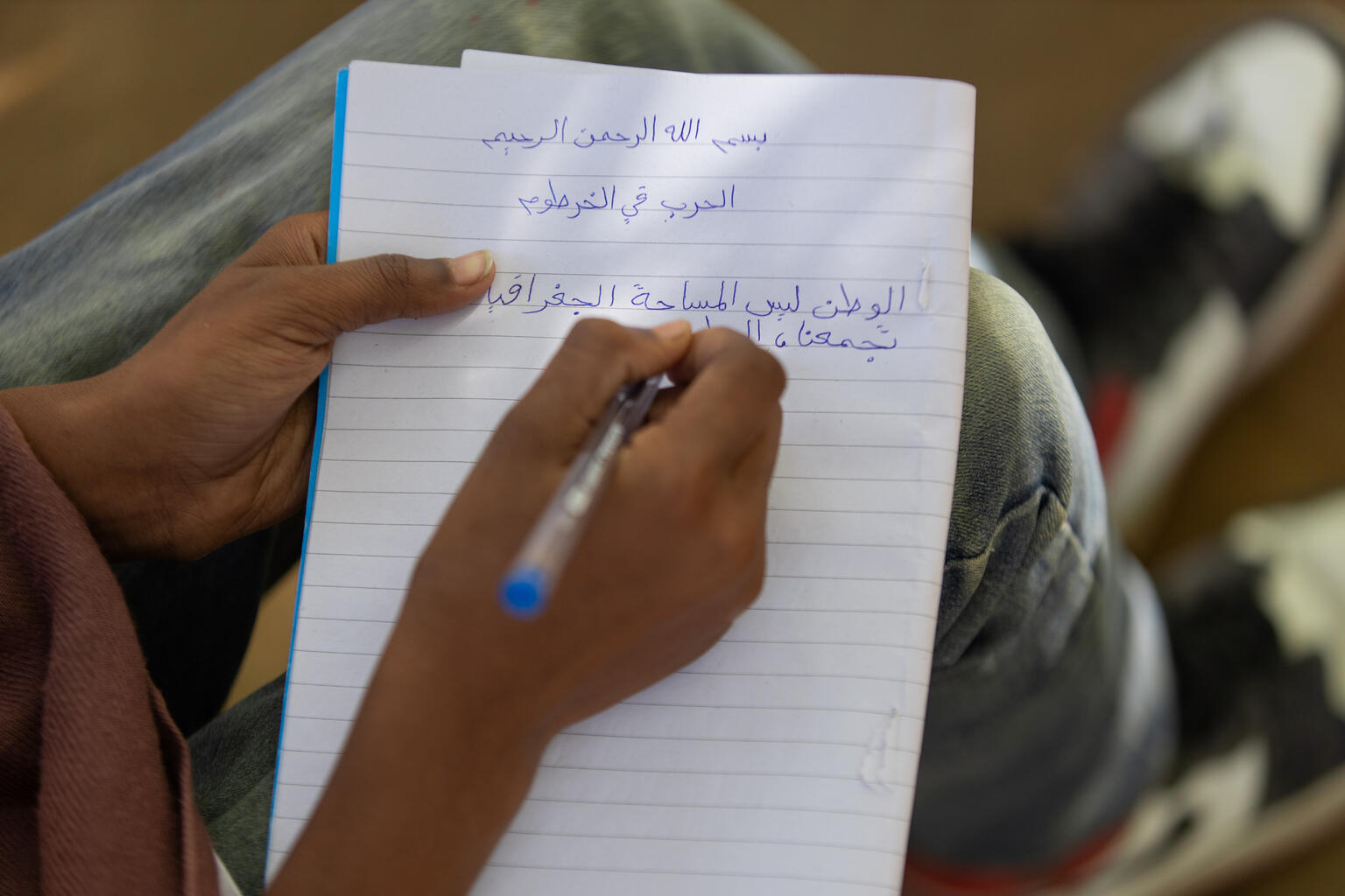 「平和の詩」をノートに綴るサマルさん(スーダン、2024年3月27日撮影)