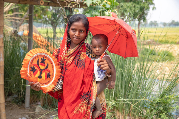 全国的な熱波に見舞われる中、日傘をさす親子。(バングラデシュ、2024年5月撮影)