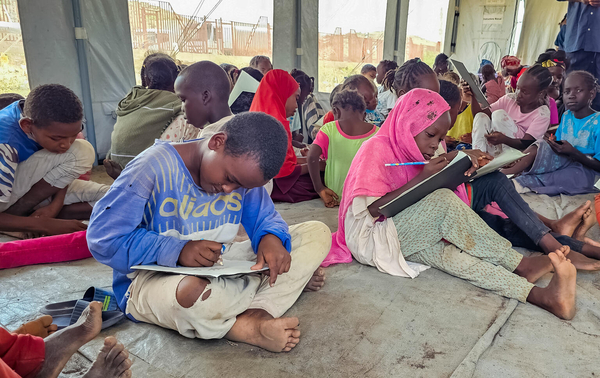 ガダーレフにあるユニセフの子どもにやさしい空間で絵を描く国内避難民の子どもたち。(スーダン、2024年7月9日撮影)