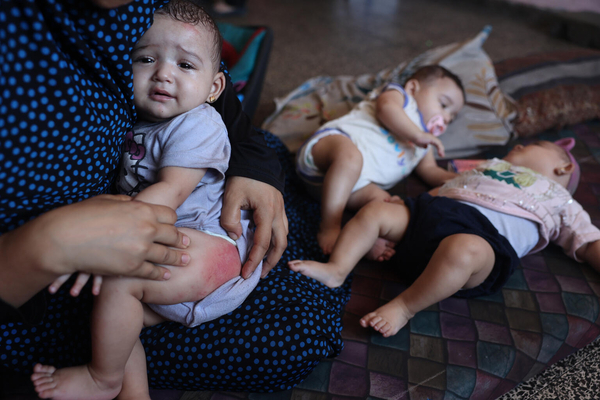 危機下で食べ物がなく、衛生状態が悪くて感染症も蔓延するなかで、妊娠期を過ごし、4つ子を出産した母親。「爆撃が続く中、地面の上で寝ているので疲れ果てています」と話す。 (ガザ地区、2024年6月撮影)