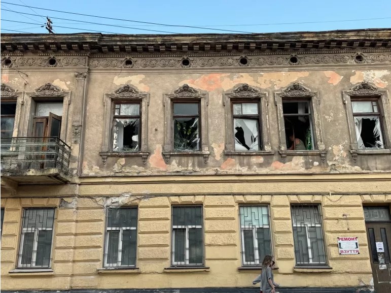 9月4日、西部の都市リヴィウがミサイルや無人機の攻撃を受けた。写真は攻撃によって窓ガラスや壁が破壊された建物(ウクライナ、2024年9月撮影)