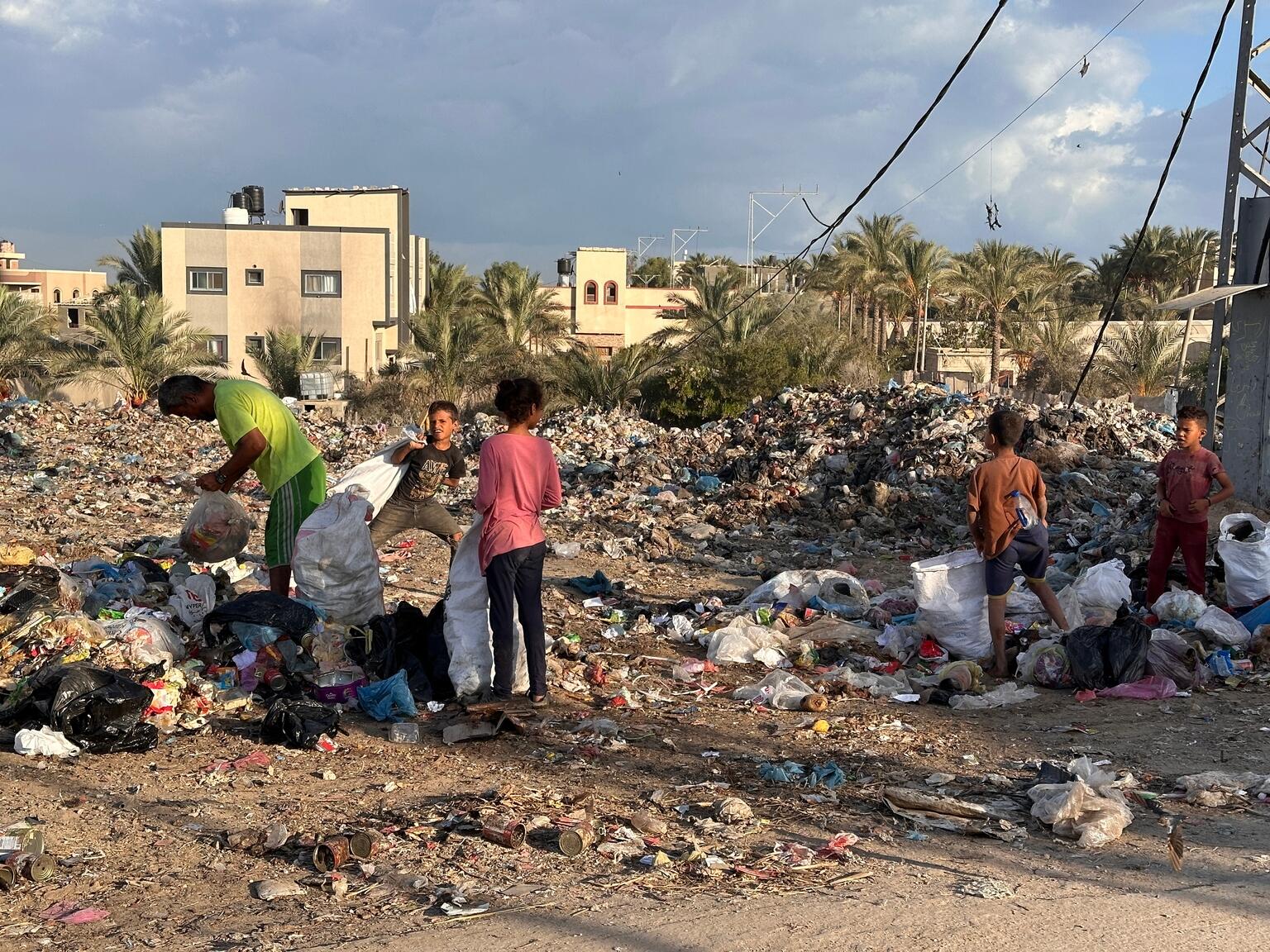 中部のデルバラハにあるゴミ捨て場で、火をおこすための燃料となる古紙や紙パックを探す子どもたち(ガザ地区、2024年9月17日撮影)