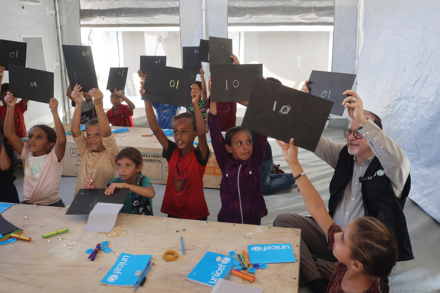 ユニセフが支援している安全な学習スペースで学ぶ子どもたち(ガザ地区、2024年9月18日撮影)