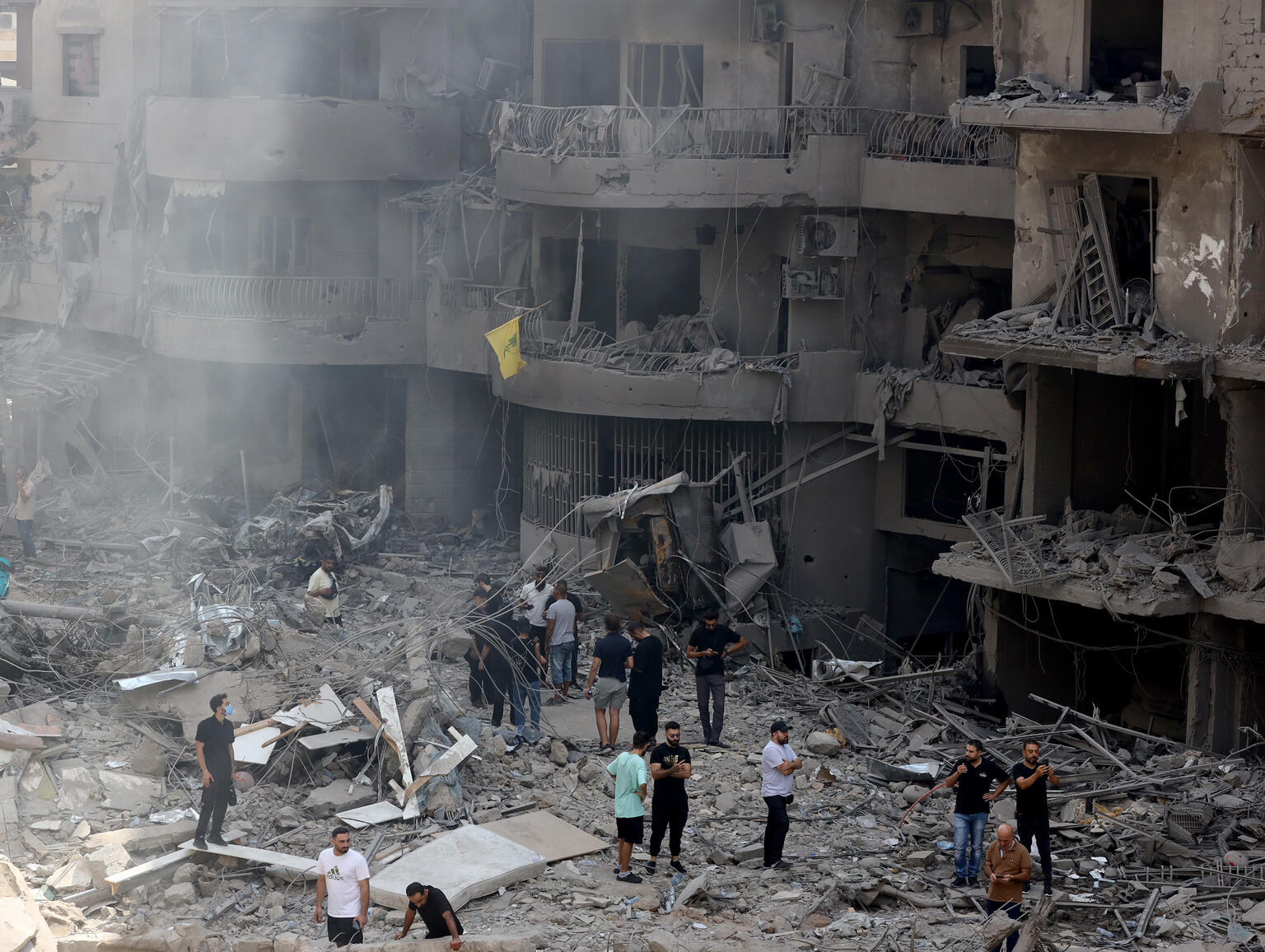 27日に行われたベイルート南郊のHaret Hreik地区への空爆により、破壊された建物の様子(レバノン、2024年9月29日撮影)