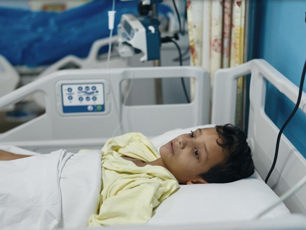 8歳のアミールさんは、レバノン南部にある自宅近くに着弾したミサイルで負傷。今は首都ベイルートの公立病院で治療を受けている(レバノン、2024年10月1日撮影)