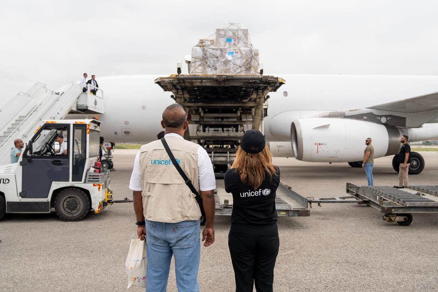 ベイルート・ラフィク・ハリリ国際空港に到着したユニセフの保健医療物資。25トンの物資には病院で使用する緊急医療キットや医薬品などが含まれており、レバノン保健省に提供される(レバノン、2024年10月6日撮影)