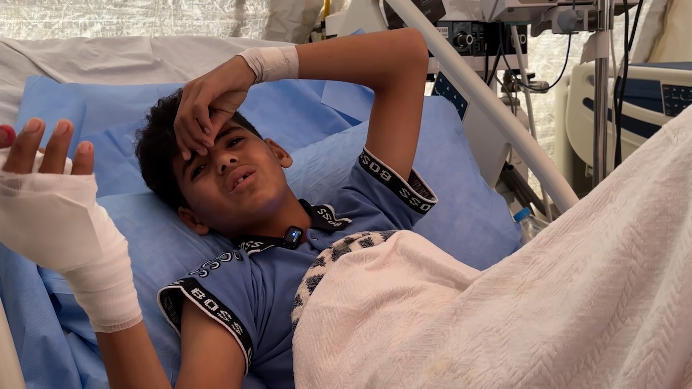 ハンユニスの病院で治療を受けている14歳のユセフさん。銃に撃たれ、ユセフさんと2人の兄弟は怪我を負い、父親は殺された。(ガザ地区、2024年4月12日撮影)