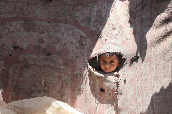 避難先のぼろぼろに傷んだテントの破れ目から顔を出す子ども(ガザ地区、2024年9月1日撮影)