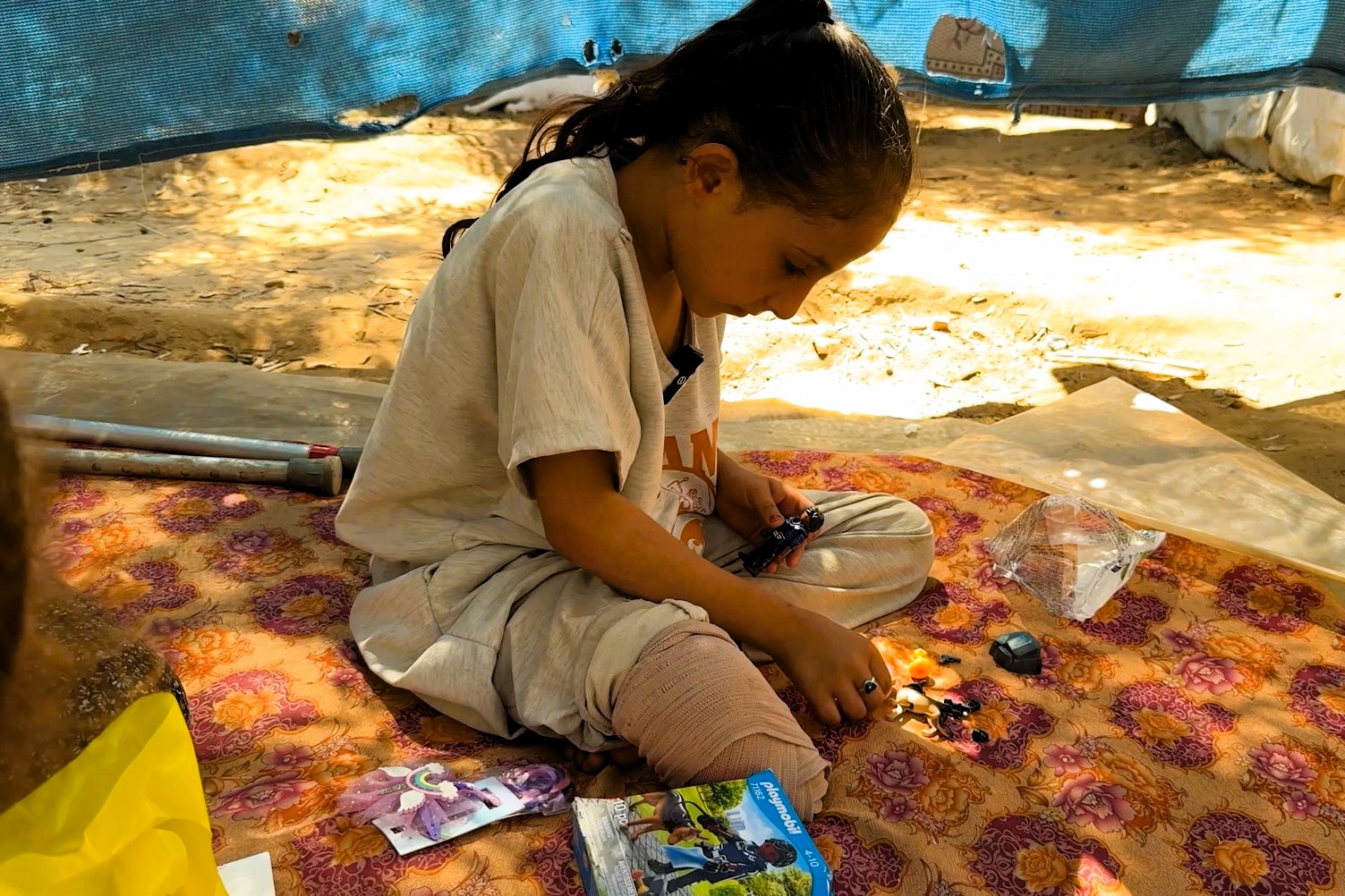 難民キャンプへの攻撃によって足を負傷し、適切な治療が受けられずに右脚を切断した7歳のカマルさん(ガザ地区、2024年10月撮影)