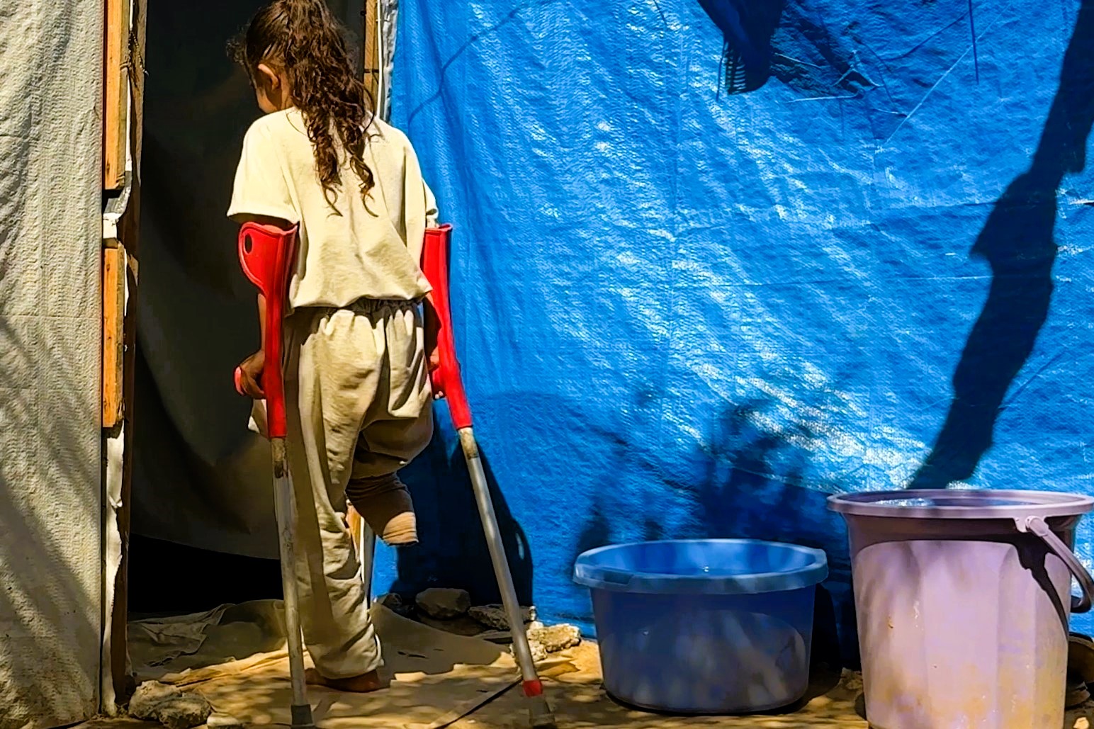 右脚を失った7歳のカマルさんは松葉杖を使いながら、徒歩での避難を強いられた。(ガザ地区、2024年10月撮影)