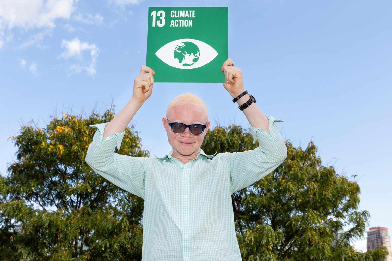 国連本部前でSDGsの目標13「気候変動に具体的な対策を」のアイコンを掲げる、コンゴ民主共和国出身のエマニュエルさん(米国、2024年9月20日撮影)