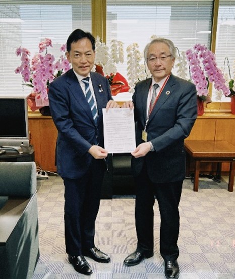 浅尾慶一郎環境大臣(左)へ、早水研日本ユニセフ協会専務理事(右)より要望書を手交
