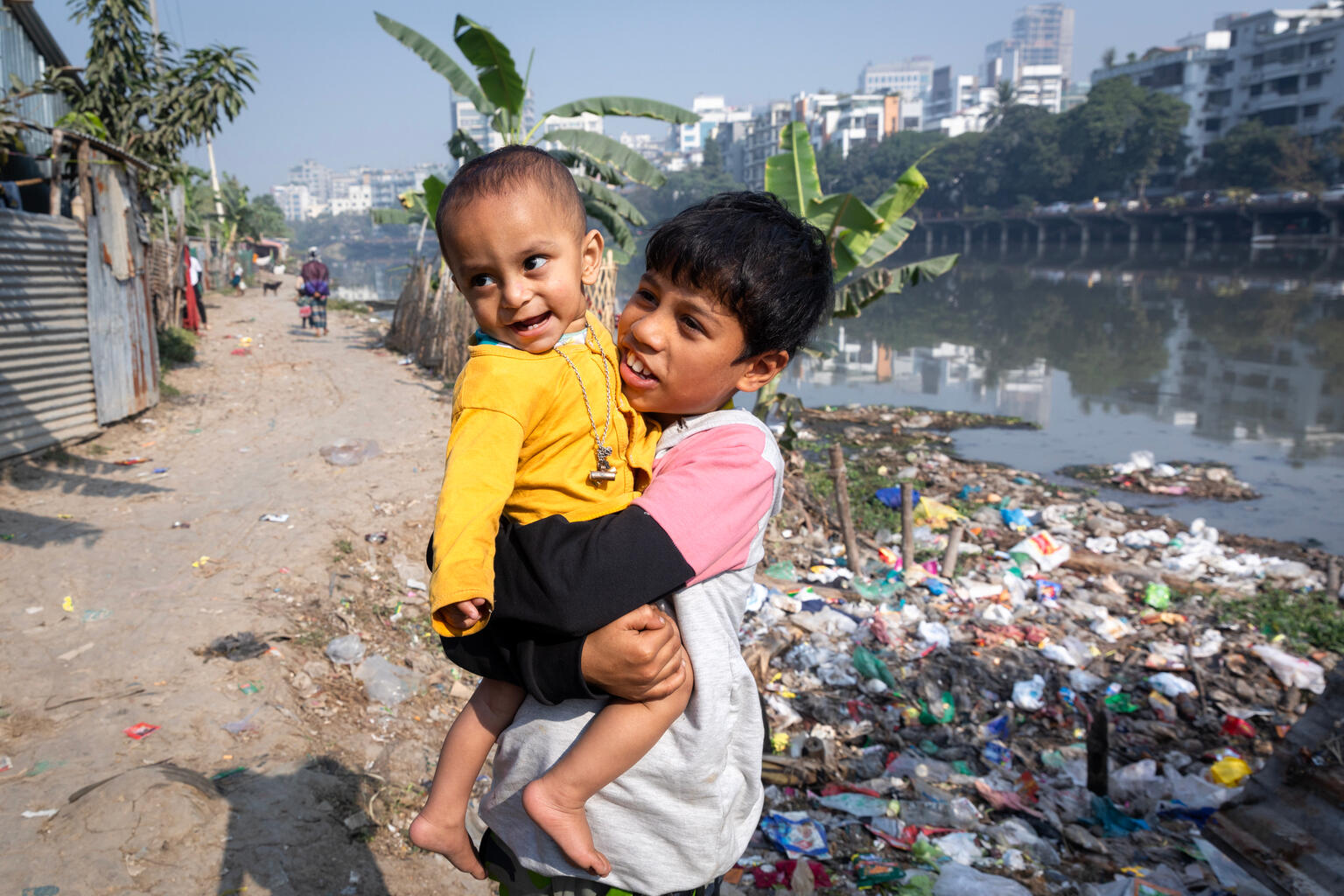 首都ダッカのスラム街で暮らす10歳と2歳の兄弟。スラム街にあるバナニ湖には、ごみや下水が流れ込み水質が汚染され、子どもたちの健康を害する要因になっている。(バングラデシュ、2024年1月28日撮影)