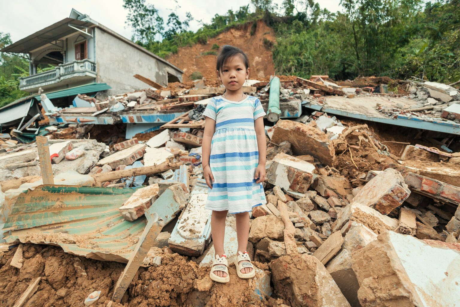 超大型台風「ヤギ」がもたらした豪雨による土砂崩れで、破壊された自宅の前に立つ6歳のカオさん(ベトナム、2024年9月12日)