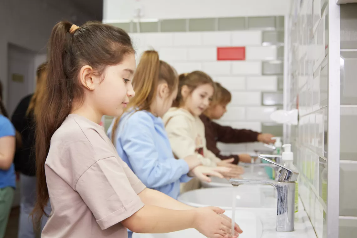 食堂で昼食を食べるる前に手を洗う、低学年の子どもたち(ウクライナ、2024年3月撮影)