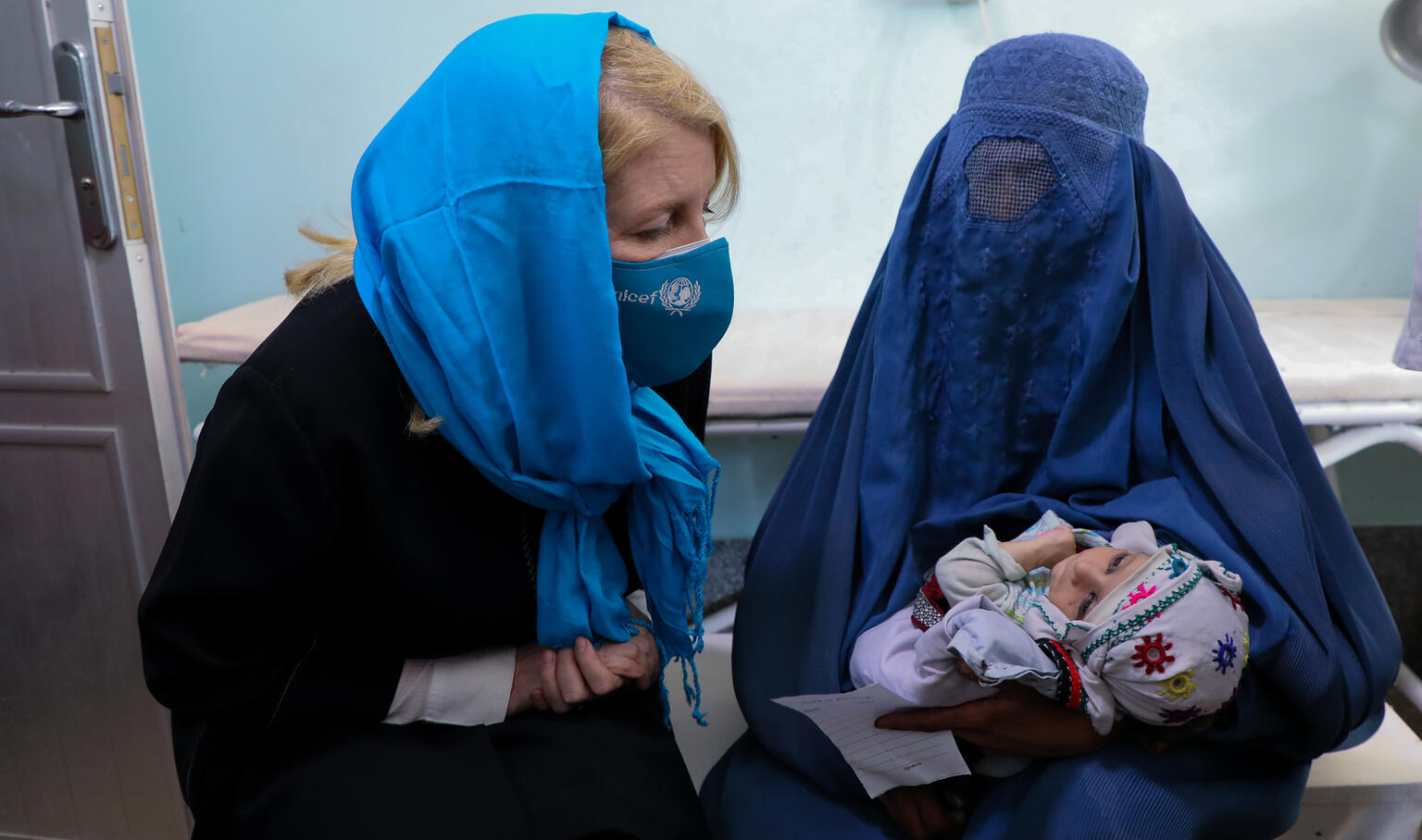 2022年に、アフガニスタンのカンダハール州にあるミルワイス地域病院を訪問した、ユニセフ事務局長のキャサリン・ラッセル。重度の急性栄養不良で入院している子どもを抱いた母親と対話した(アフガニスタン、2022年2月24日撮影)