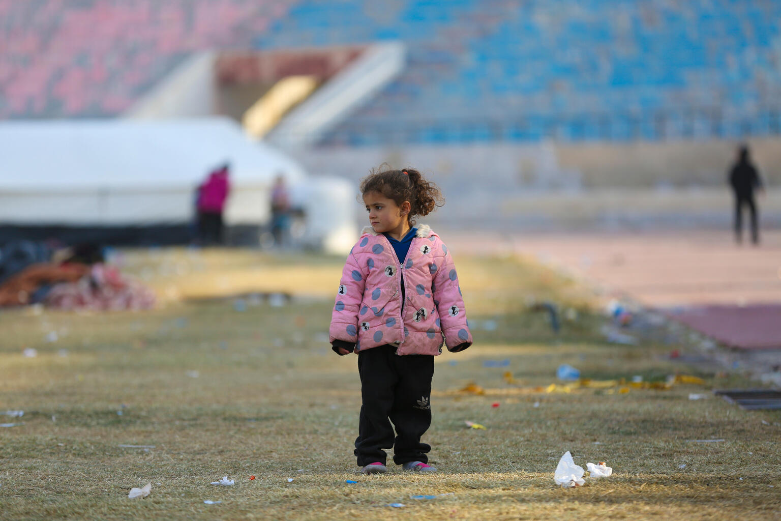 厳しい寒さの中、アレッポの戦闘から逃れて、家族とともにラッカ市の一時避難施設に到着したばかりの女の子(シリア、2024年12月4日撮影)