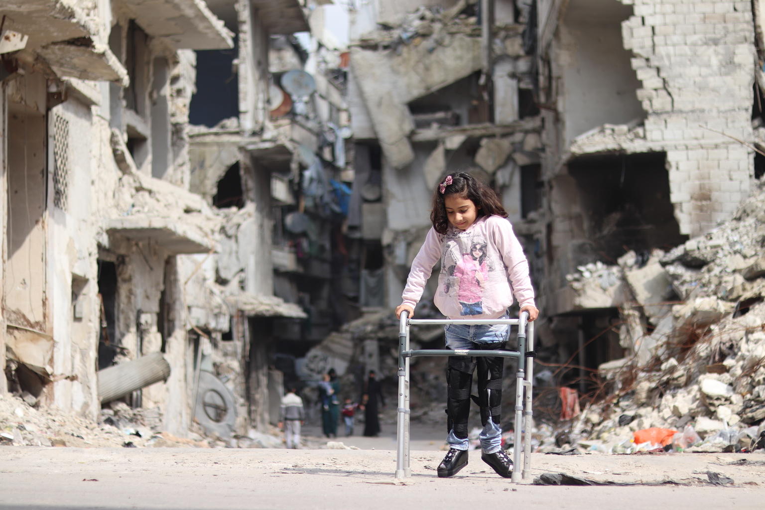 アレッポ東部にて、爆撃で被害を受けた建物の間を、歩行器を使って歩く8歳のラマちゃん(シリア、2018年3月7日撮影)