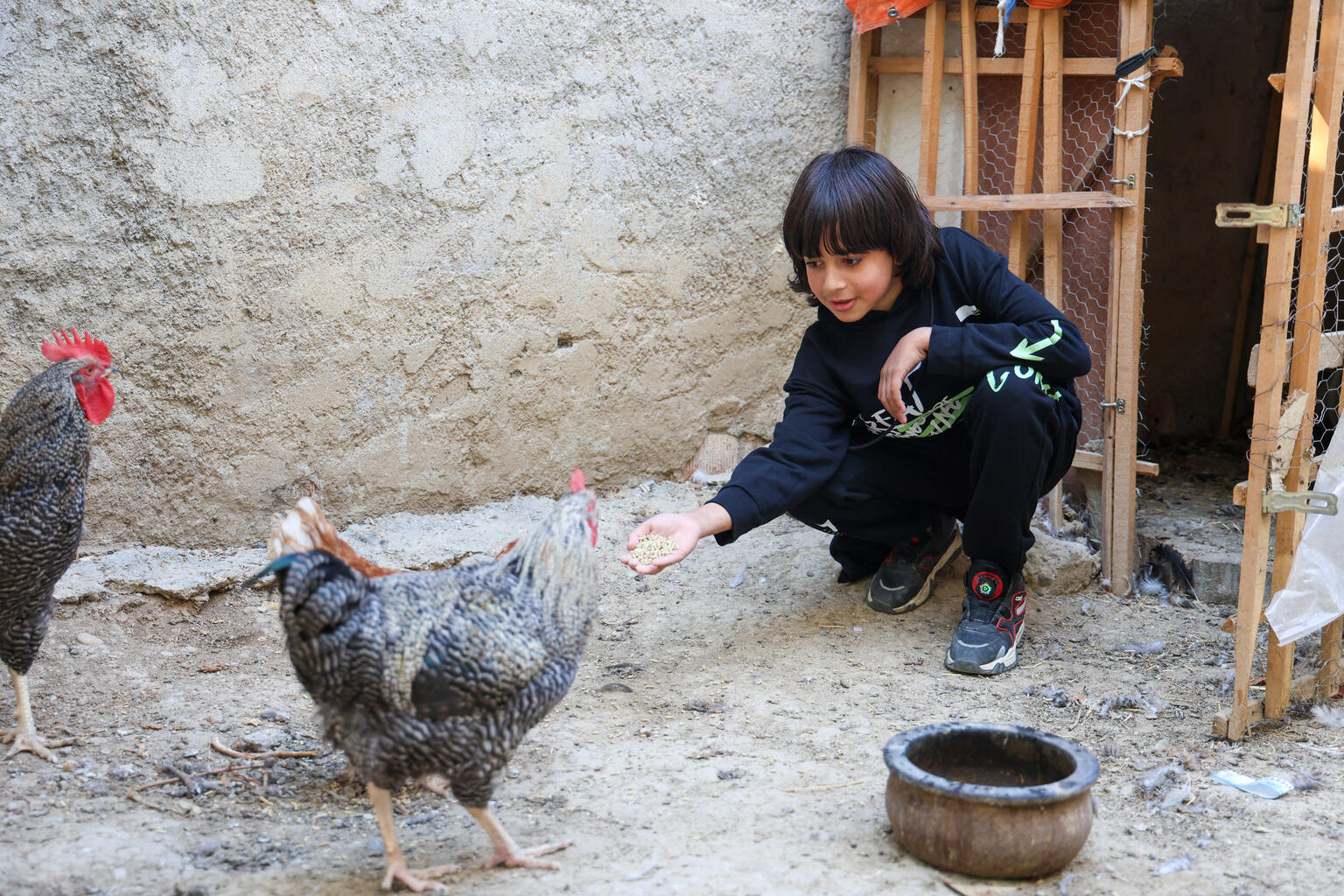 自宅の庭で飼っている鶏に餌をあげるテイムッラーさん(トルコ、2024年11月13日撮影)