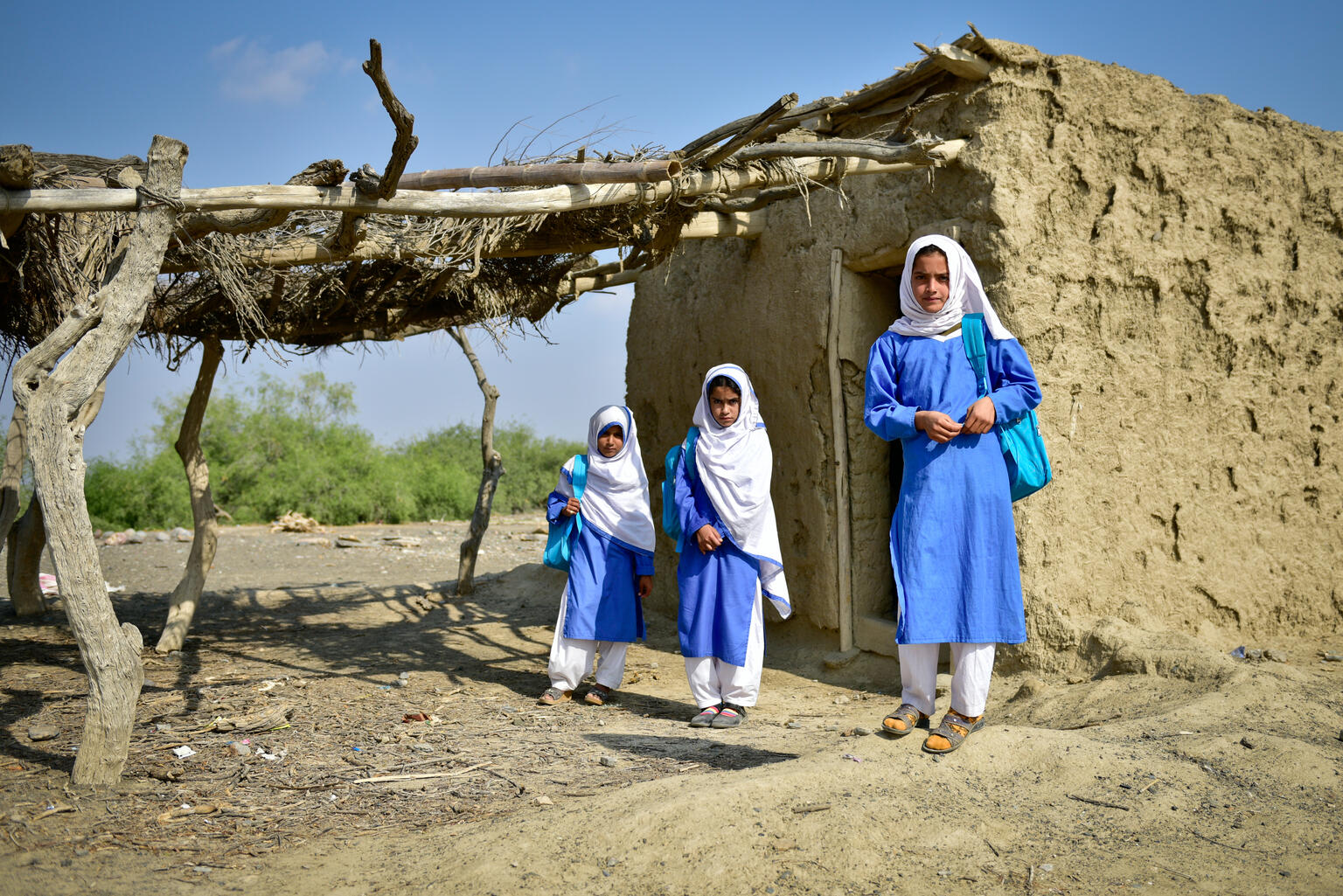 洪水で破壊されたままとなっている、泥でできた旧校舎の前に立つ10歳のアクサさん(右)。バロチスタン州にあるこの小学校では、ユニセフなどの支援で新しい校舎が建てられた(パキスタン、2024年2月7日撮影)