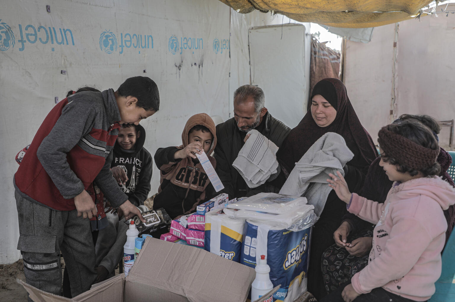 ガザ地区南部のハンユニスで、ユニセフ支援の衛生キットを受け取るイスラムさん(9歳、右端)とその家族(パレスチナ、2025年1月23日撮影)