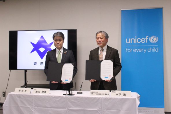 その後、豊田市の太田稔彦市長と日本ユニセフ協会CFCI委員会の木下勇委員長が、覚書に署名しました。