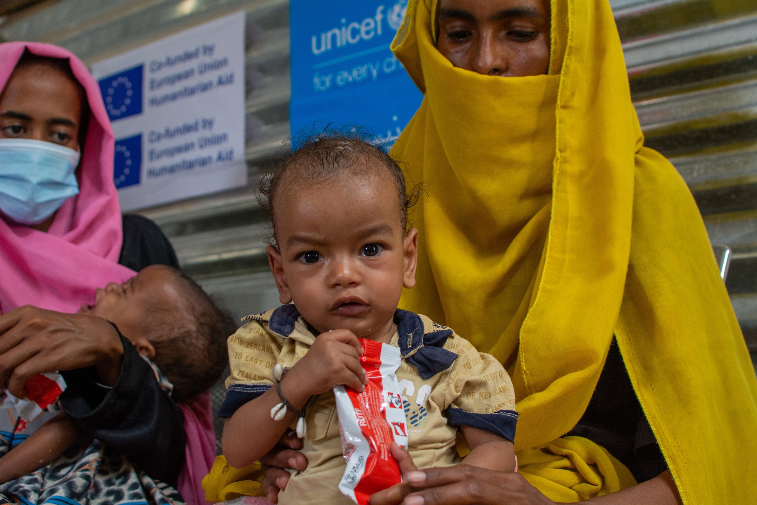 イスマイルちゃんは約1カ月前から、下痢と嘔吐を繰り返すようになりました。クルードさんは栄養不良を心配し、検査のため、イスマイルちゃんを保健センターに連れて行きました。センターのスタッフはイスマイルちゃんに、すぐに食べられる栄養治療食を与えました。ユニセフが支援現場で用いる栄養治療食「プランピー・ナッツ」は、エネルギー値の高い微量栄養素ペーストで、ピーナッツ、砂糖、粉ミルク、油、ビタミン、ミネラルから作られています。