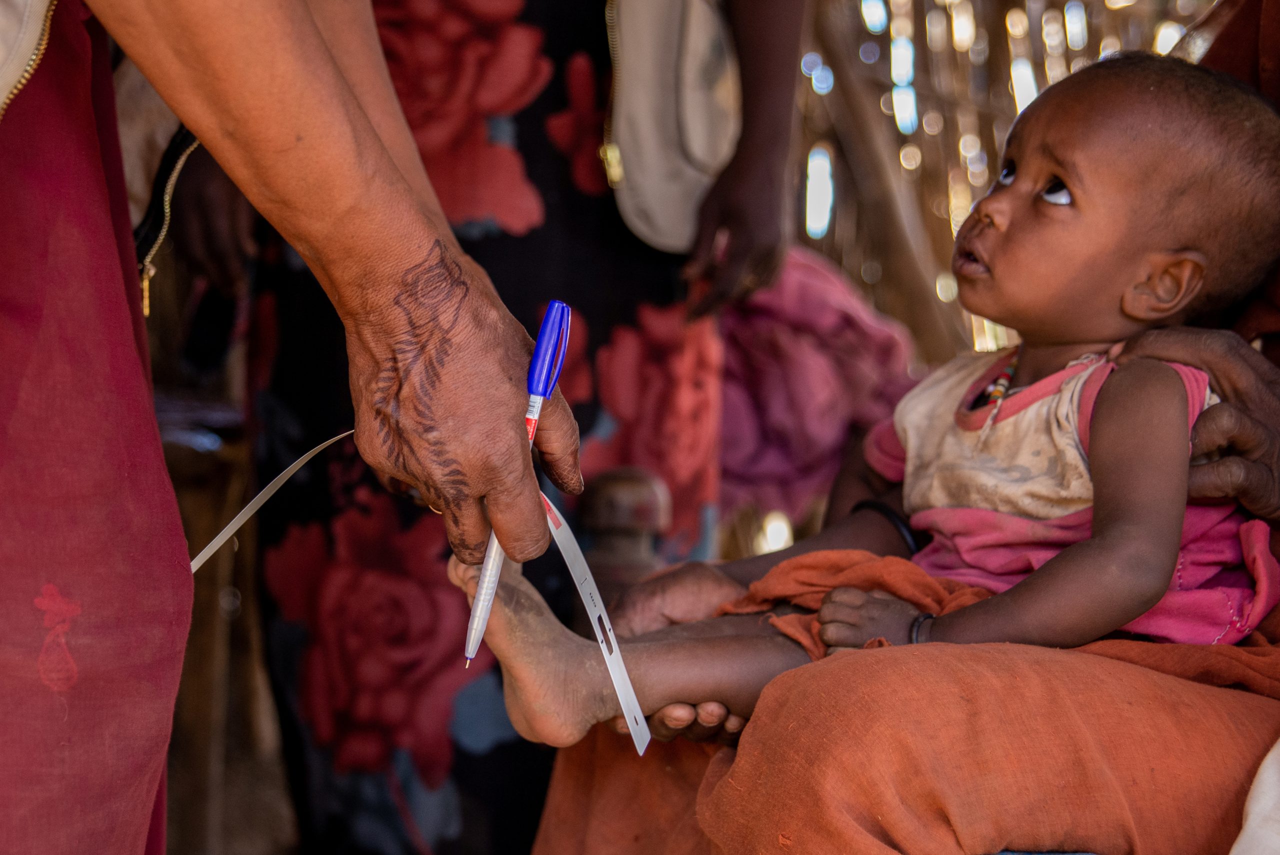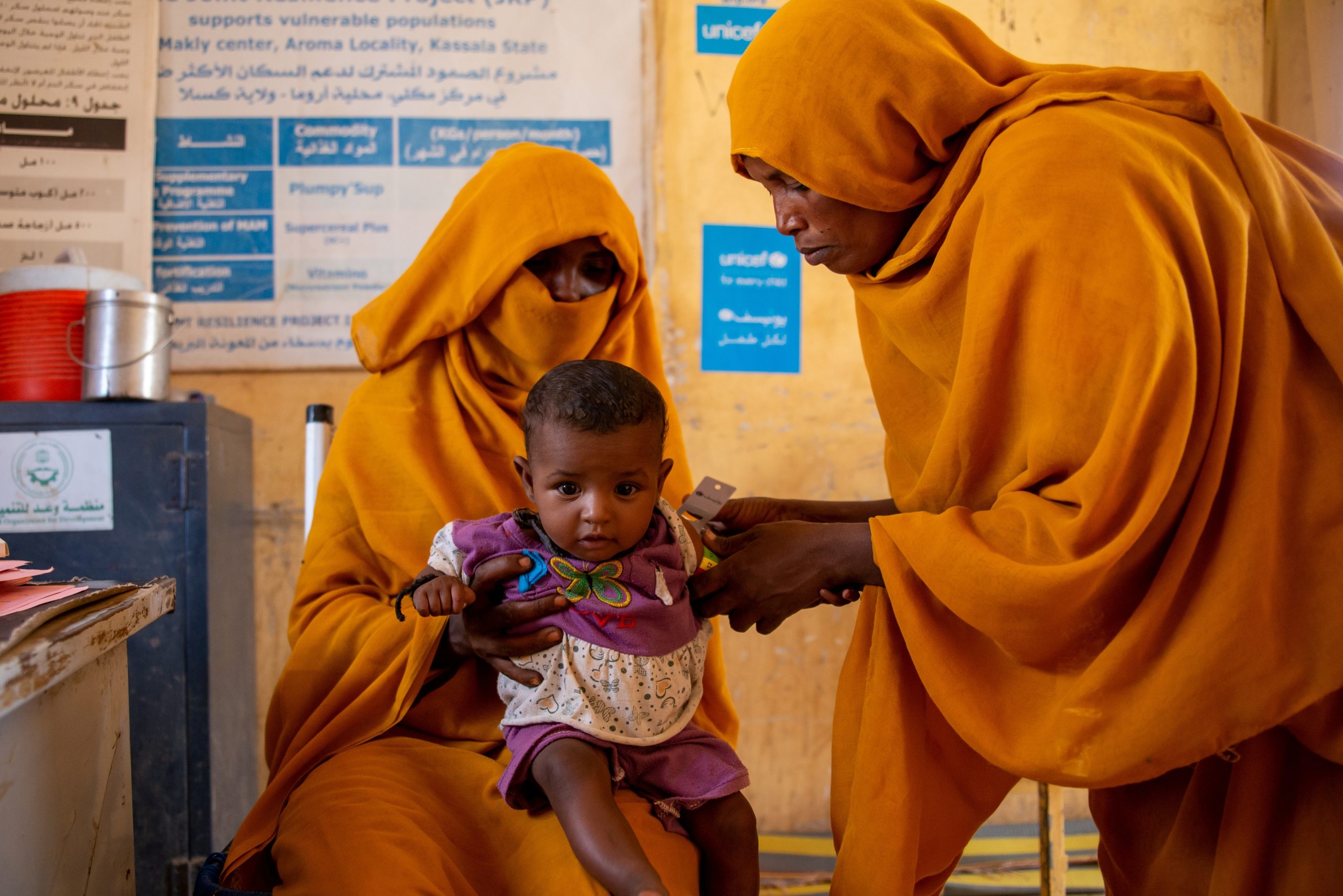国中で飢きんのリスクが高まっていることを受け、ユニセフは栄養支援を急速に拡大し、パートナーとともに取り組んでいます。東部のカッサラ州アロマでは、ユニセフの支援で、保健ボランティアのチームが家々を訪問し、子どもの栄養状態の検査を行っています。