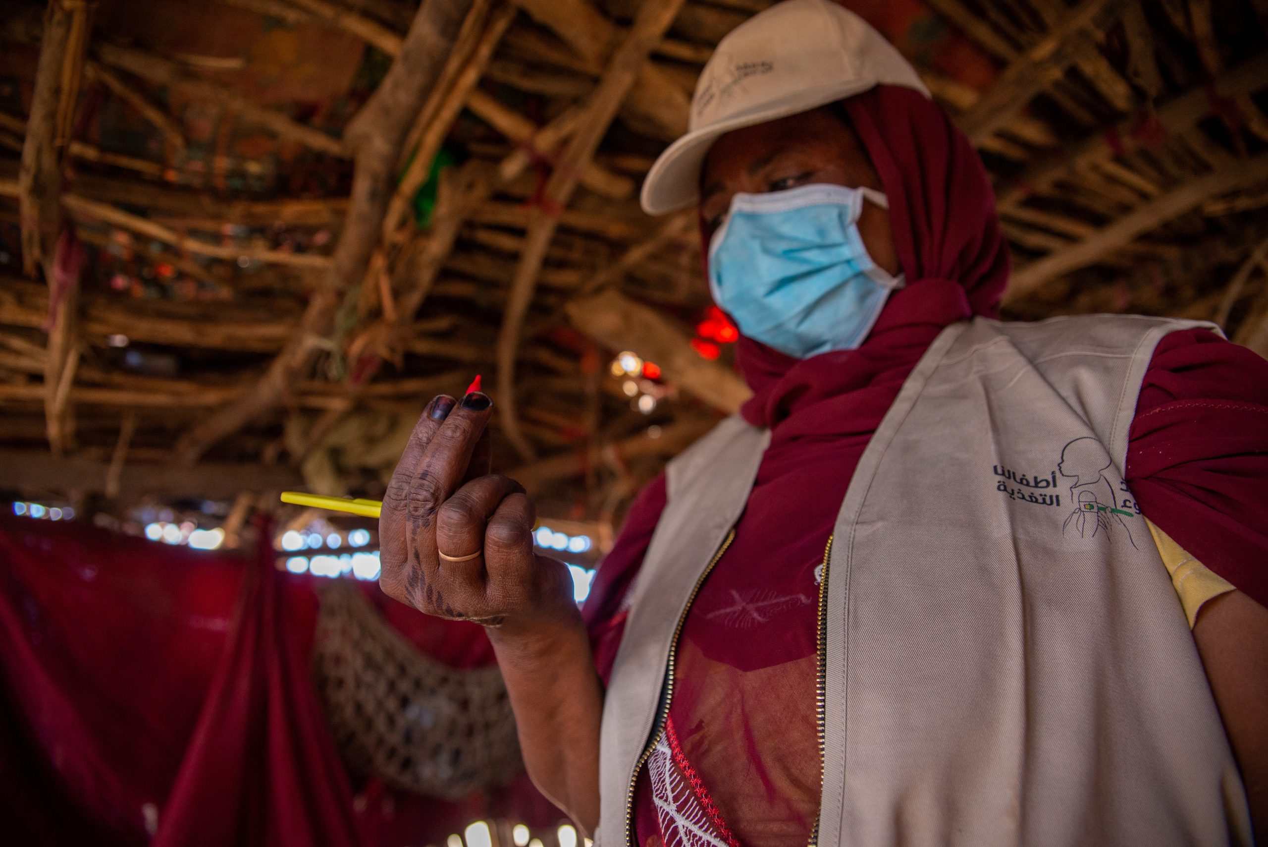 子どもにビタミンAを投与する準備をする、ボランティアの保健スタッフ(スーダン、2024年12月2日撮影)