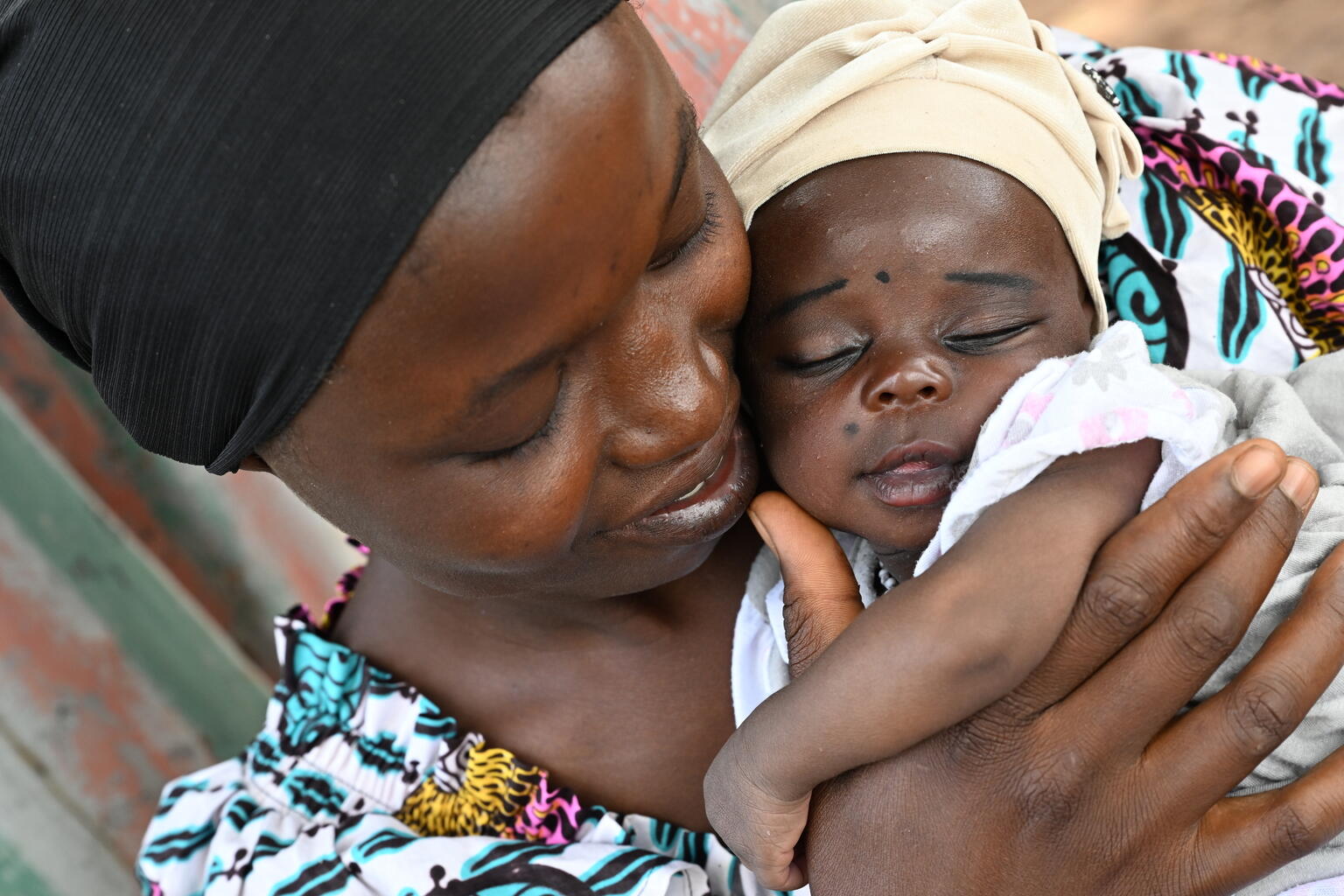 子どもの栄養や母乳育児についてアドバイスを受けるため、保健センターを訪れたコロトゥムさんと娘のマリアムちゃん(コートジボワール、2024年7月2日撮影)