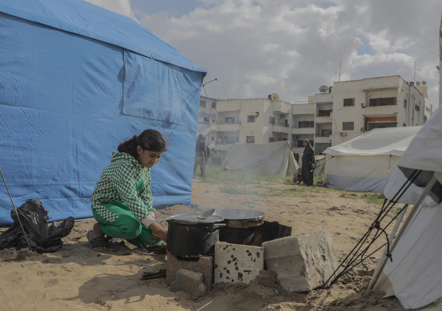 ガザ市内の学校で家族とともに避難生活を送り、食事の支度を手伝う12歳のアリーンさん(パレスチナ、2025年3月20日撮影)