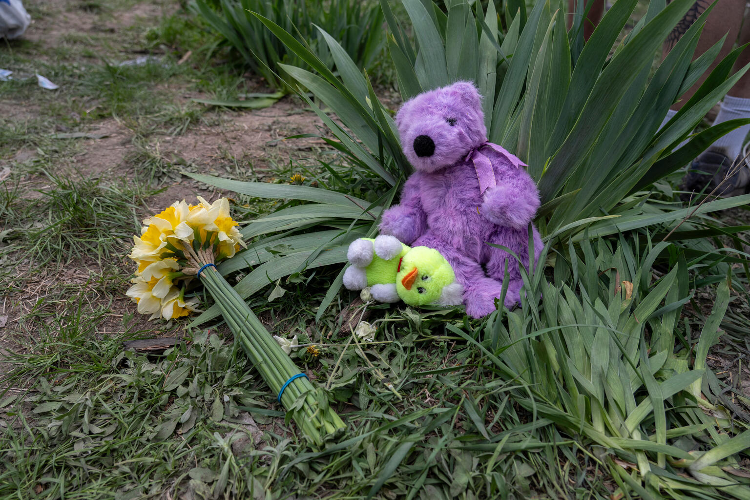 ミサイル攻撃の現場近くに供えられた花束とぬいぐるみ。早朝の住宅街への攻撃により、子ども3人を含む12人が死亡した(ウクライナ、2025年4月24日撮影)