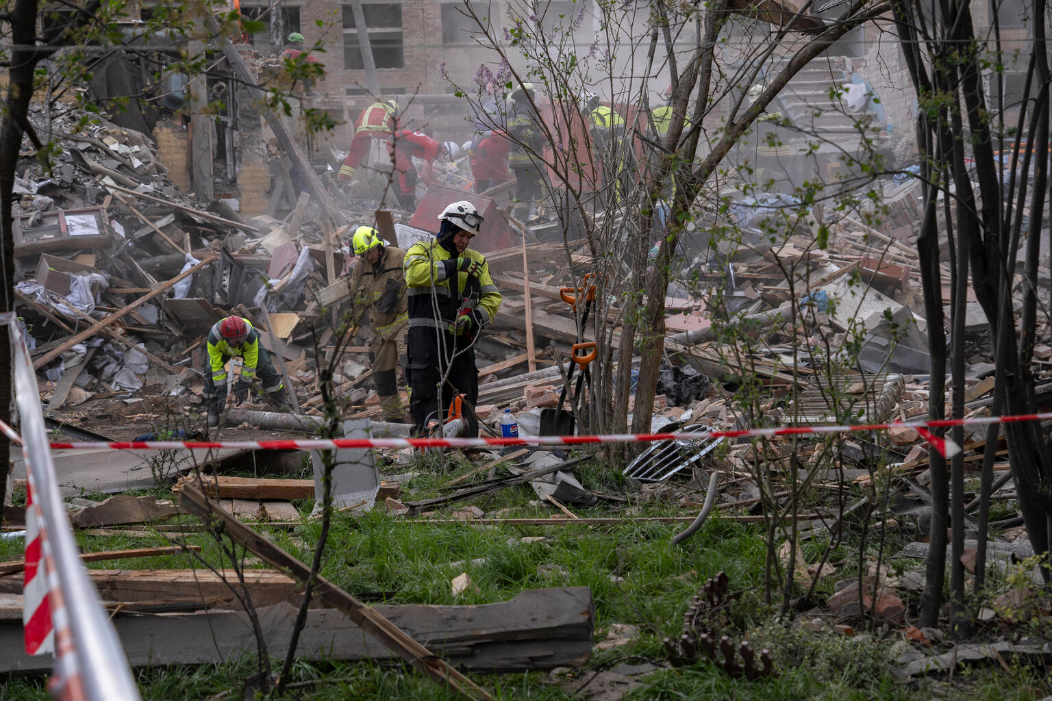 ミサイル攻撃により破壊された住宅街の建物。レスキュー隊員が、がれきの下に取り残された生存者を捜索している(ウクライナ、2025年4月24日撮影)