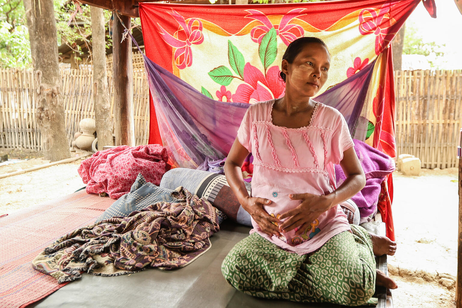 出産を控えた39歳のこの女性は、ネピドーで被災し、ユニセフから新生児用キットなどの支援物資を受け取った(ミャンマー、2025年4月12日撮影)