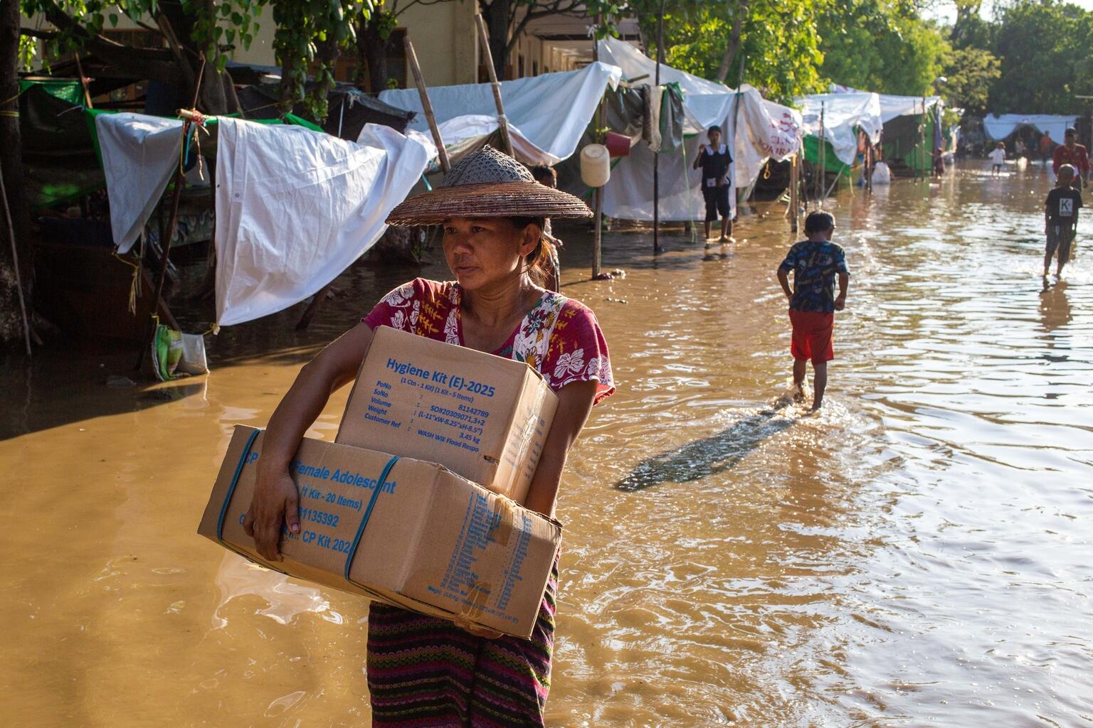 マンダレーの仮設キャンプで、ユニセフから受け取った支援物資を抱えて歩く女性。大雨の影響で、キャンプ内は浸水している(ミャンマー、2025年4月16日撮影)